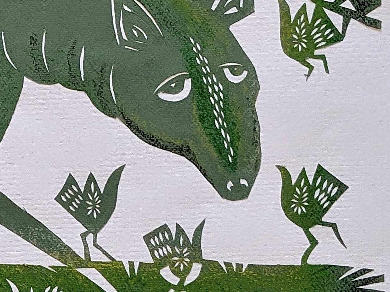 This papercut is a metaphor for the human condition in times of trial. The beast personifies the pain and fatigue experienced by the world or by humans, while the birds and trees represent spiritual strength and the ability to be reborn.