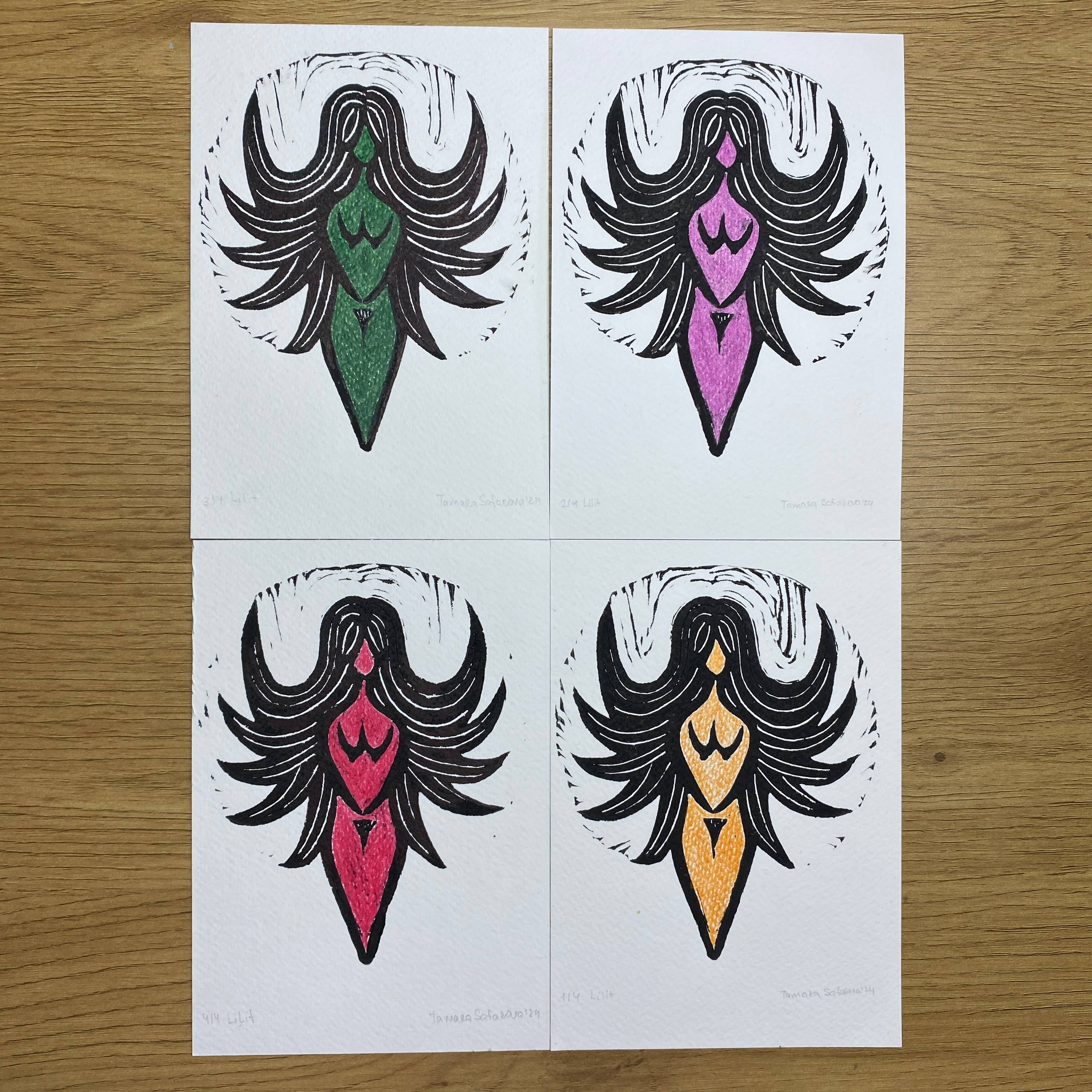 Linocut, colored pencils